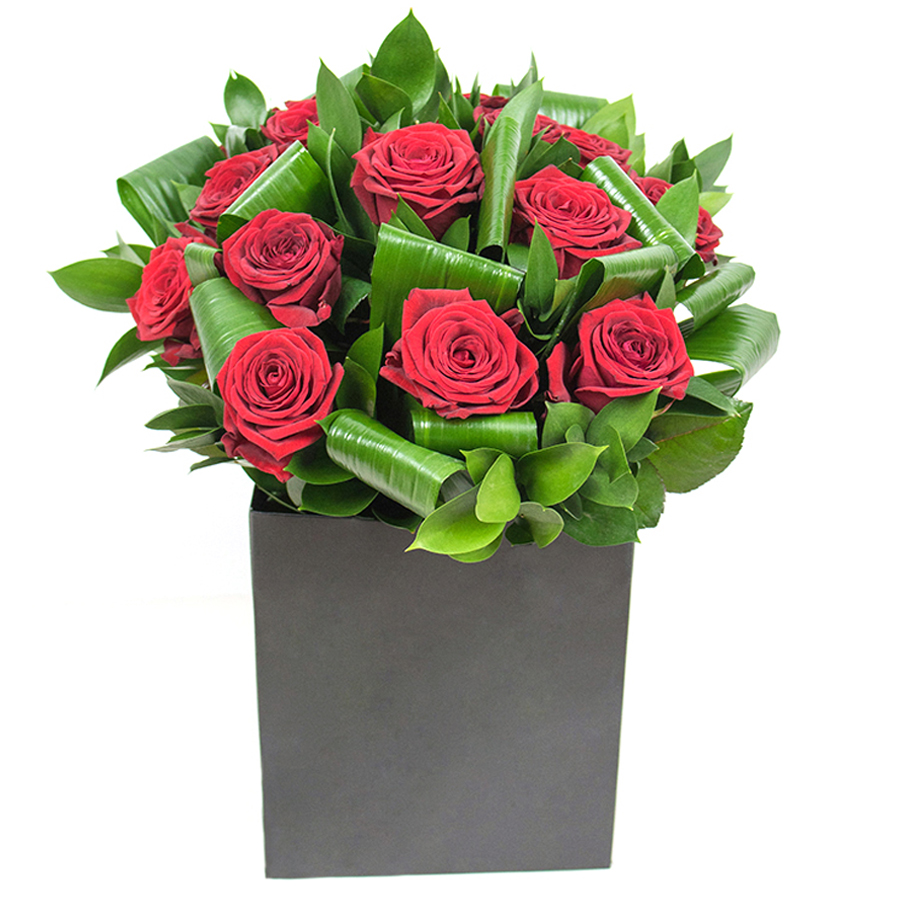 Brighten any room with our vibrant red rose bouquet, featuring lush red roses, elegant aspidistra leaves, and delicate ruscus. This unique design brings color and life to your home.